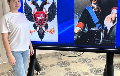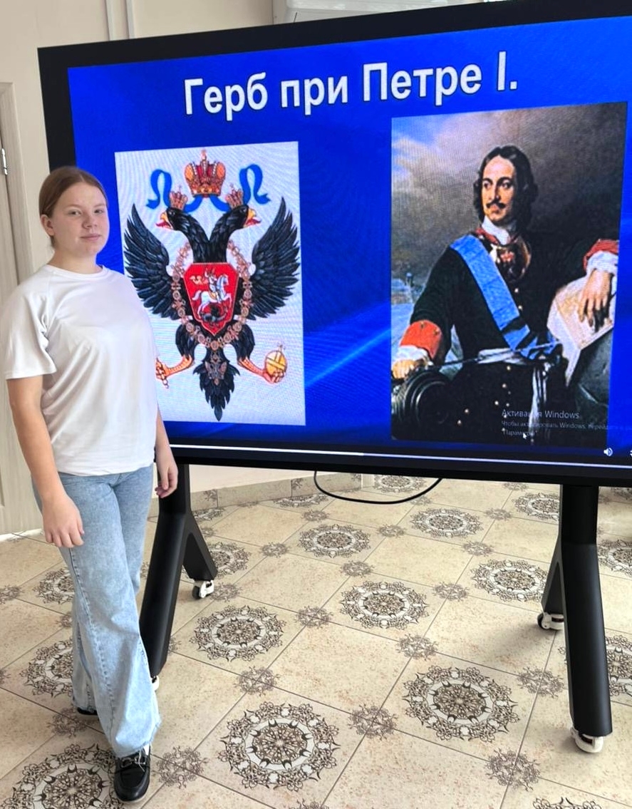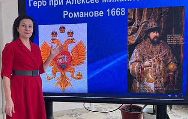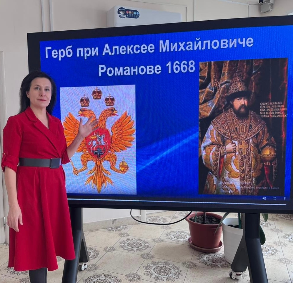 Педагог-библиотекарь Гульшат Гаязовна Хисматуллина рассказала об истории герба, о том, как менялись его элементы на протяжении веков и какие исторические события влияли на его облик. Особое внимание было уделено символике двуглавого орла, скипетра и державы, а также значениям цветов на гербе.